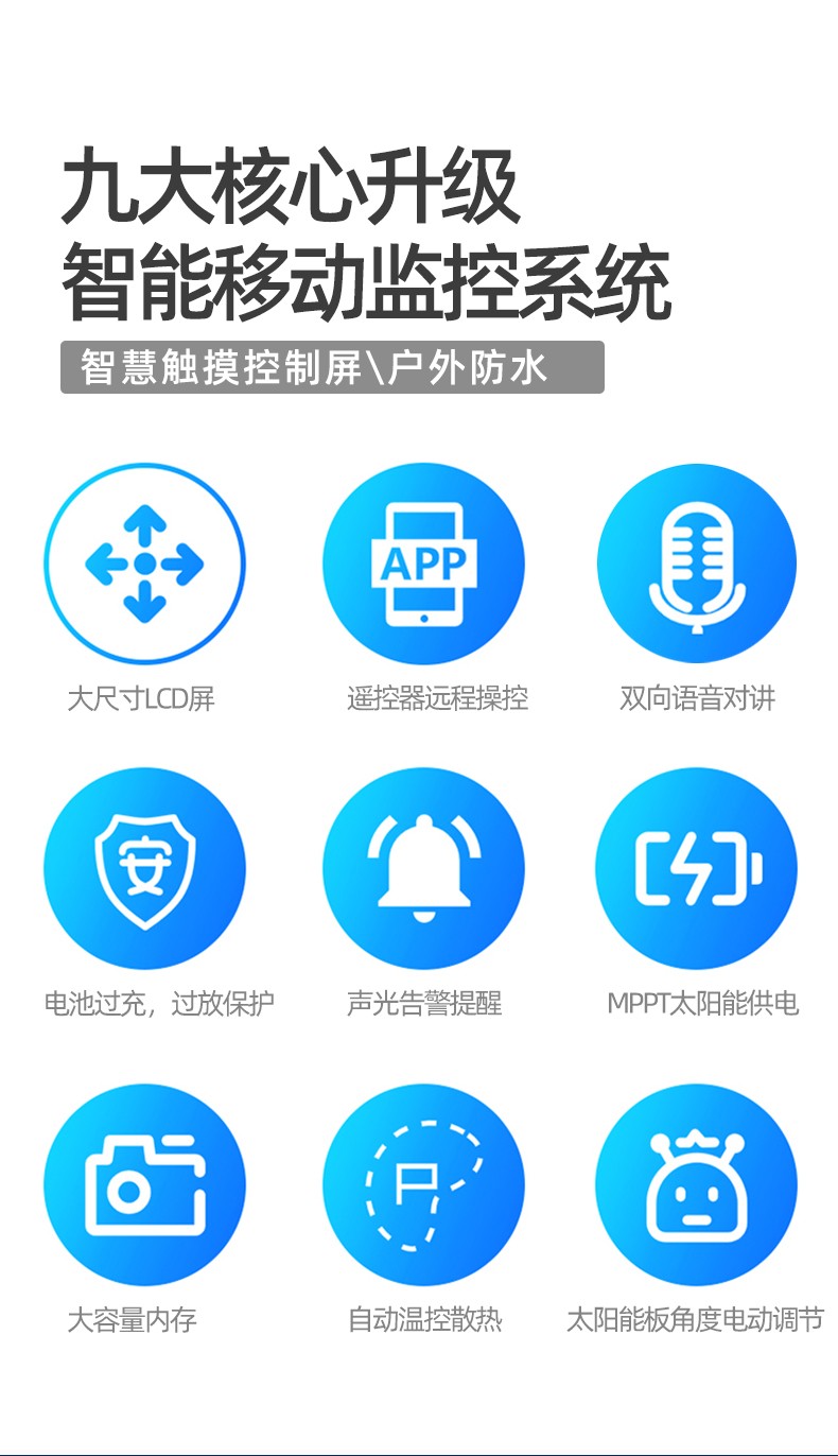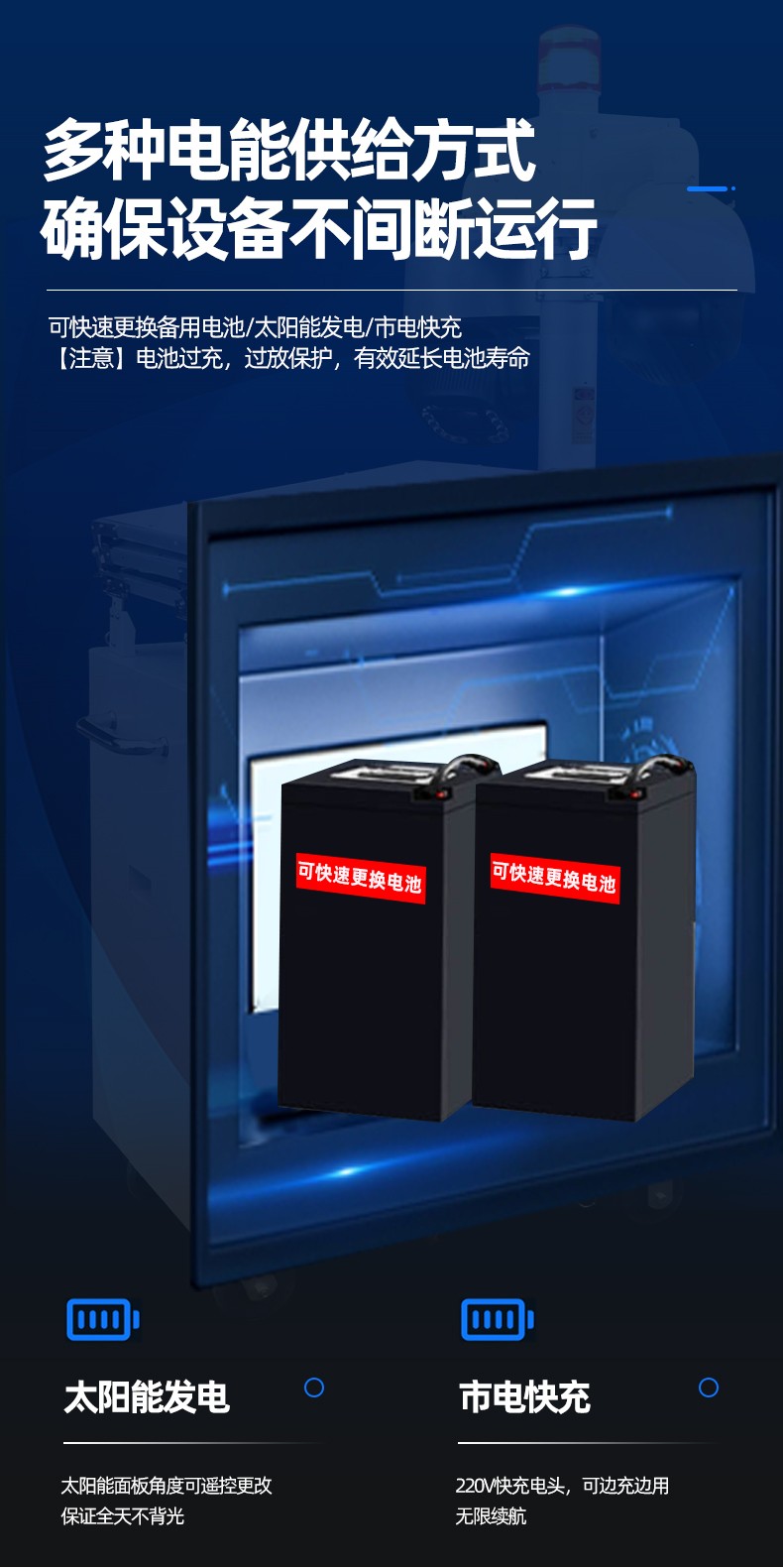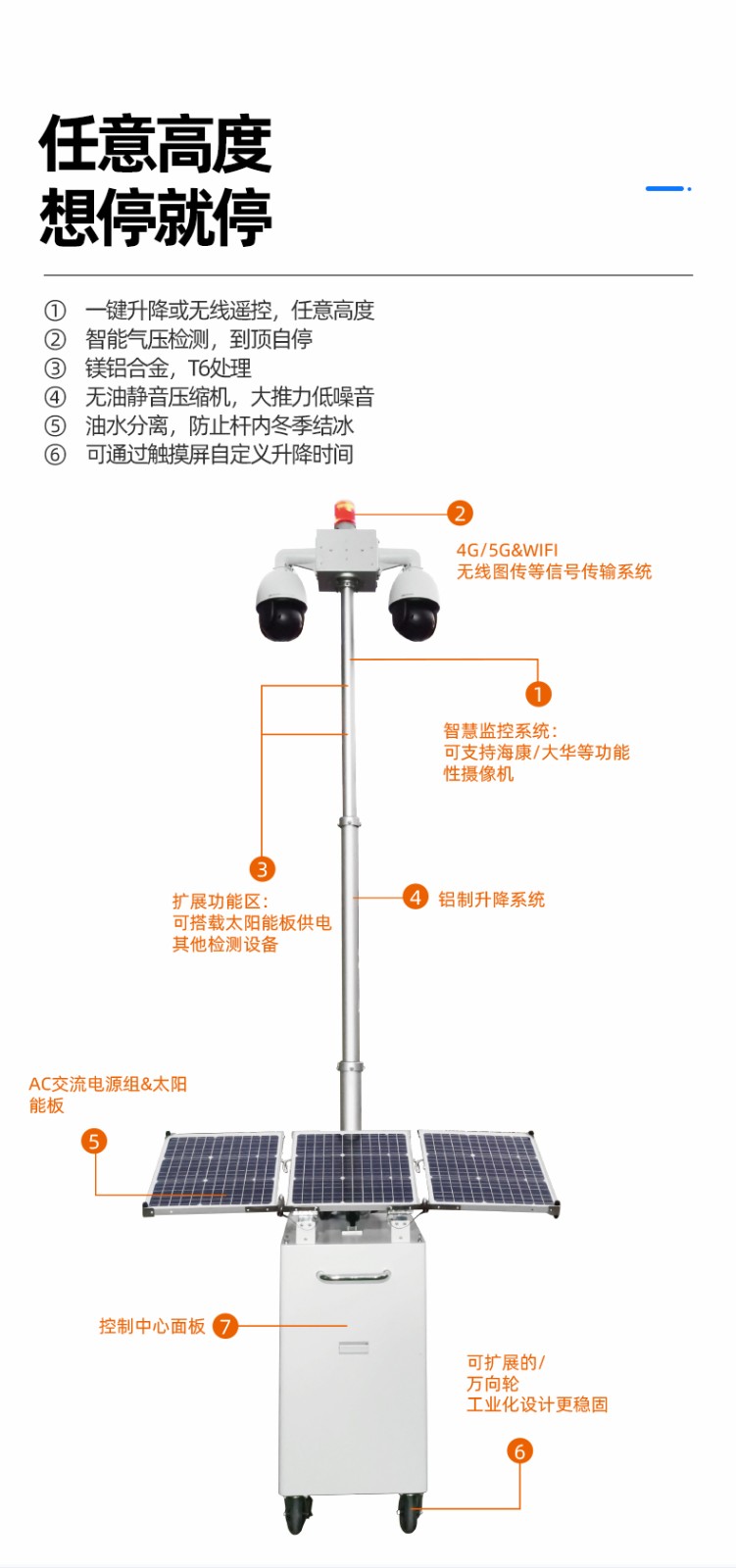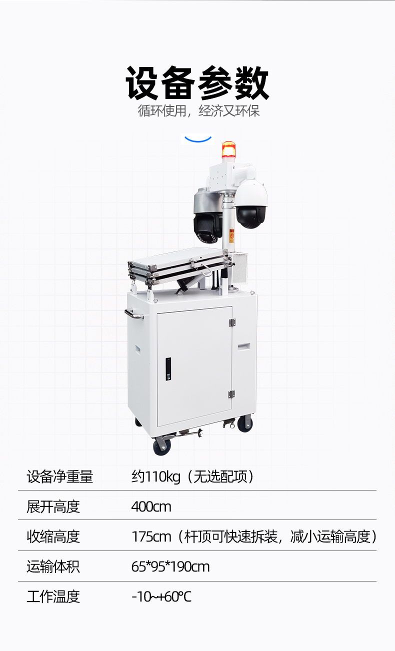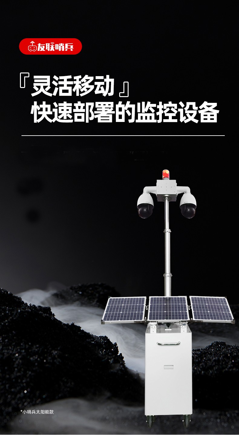 友聯哨兵多功能移動兵站(輕便型小哨兵移動監控)是一款十分靈活的中小型移動監控設備,自帶網電,具備較高的機動性,系統可集高清視頻監控、照明、報警、廣播、對講、氣象環境監測、存儲、控制、無線傳輸、一鍵升降等功能于一體,并可具備市電、太陽能等多種能源補給方式,提升續航時間,以適應各類復雜的環境。戶外使用,不懼風雨,隨需移動,循環利用。可廣泛用于石油管道巡檢、工地監控、電力維修監控、活動安防、戶外作業等臨時監控或長期監控。